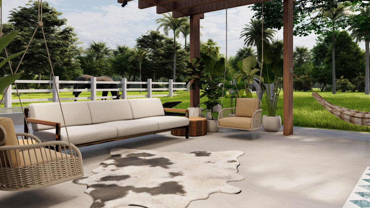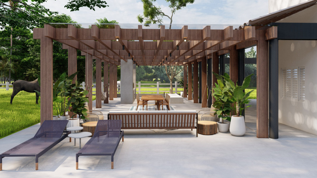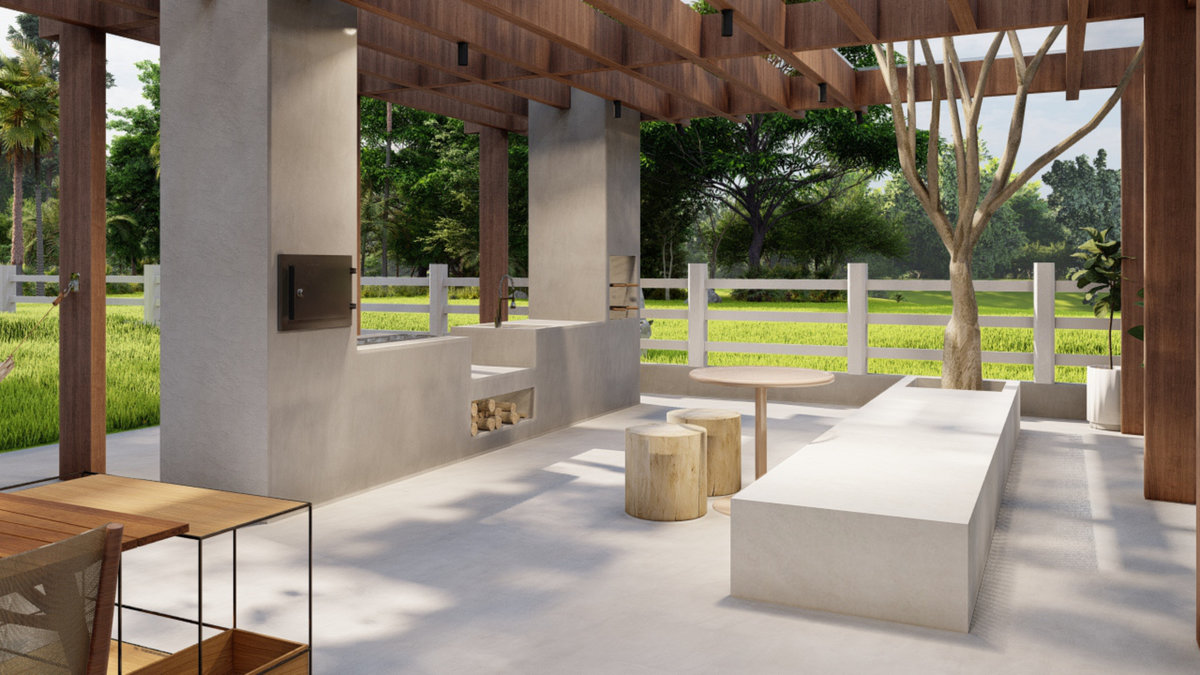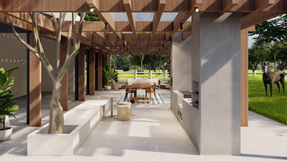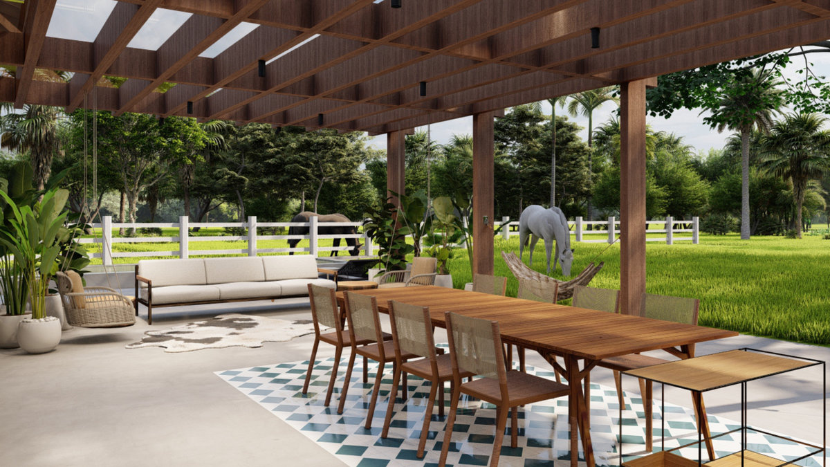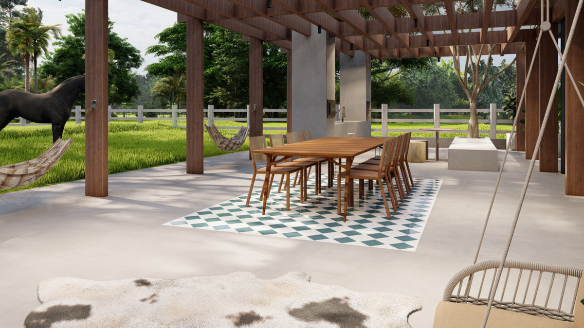 a ideia central do projeto da fazenda ‘‘tp’’ era criar um espaço de convivência, lazer e gastronomia pensado para receber família e amigos. mantendo a identidade rústica do local, apostamos em materiais como madeira e couro para aquecer a composição. o mobiliário de área externa e o piso de ladrilho hidráulico foram escolhidos não apenas pela resistência, mas também pelo apelo estético, trazendo sofisticação ao ambiente. a cobertura translúcida e as aberturas laterais permitem que a luz natural seja protagonista, ao mesmo tempo em que garantem ventilação cruzada e conforto térmico ao longo do dia.